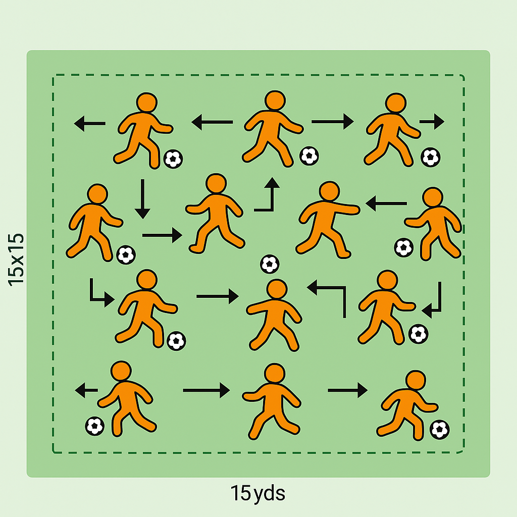 Setup: 15x15 yard grid. Each player has a ball.